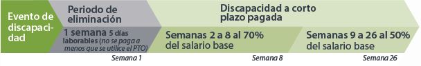 A los miembros del equipo especializados, no sindicalizados de Mortenson que hayan sido empleados de Mortenson durante al menos 6 meses (inscritos o no inscritos en el plan médico) se les pagará un seguro de discapacidad a corto plazo (Short-Term Disability, STD) al 70% del salario base durante las primeras ocho semanas de su discapacidad después de un período de eliminación de 1 semana o 5 días hábiles. Beneficios de STD para miembros del equipo elegibles y que no estén trabajando debido a una enfermedad o discapacidad calificadas. Este programa continuará con una parte de su salario base, hasta un máximo de 26 semanas. Los pagos de beneficios se pueden encontrar a continuación: